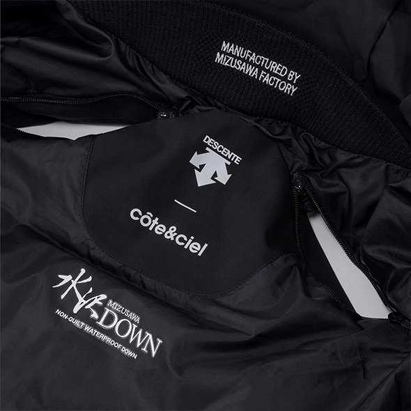 先進的なデザイン性と実用性を兼ね備えたアイテムを提案し続けるパリ発のcôte&ciel との協業でアップデートした水沢ダウンジャケット「クロニクル」。高いウォータープルーフ性能はそのままに、別モデルのバックパック「 SORMONNE MÉTAMORPHE 」とドッキングが可能な仕様。後肩部分のファスナー開口部からバックパックのストラップを差し込んでバッグを背負うことで、ジャケットのシルエットを阻害せずにジャケットとバックパックの着用が可能。フロントジッパー部分に採用されたデュアルジップベンチレーションは、 2 列のジッパーとその間に配置されたメッシュ生地により衣服内に外気を取り込み、ジャケット内にこもりやすい不快な熱や湿気を逃がすことが可能。裏地には保温素材 HEATNAVI を使用し、衣服内を快適な温度にキープ。さらに「 DOWNPASS 」認証を取得したトレーサブルダウンを使用しシリアルナンバーによる厳正な管理を行うことで全ての羽毛の調達過程を追跡することが可能。