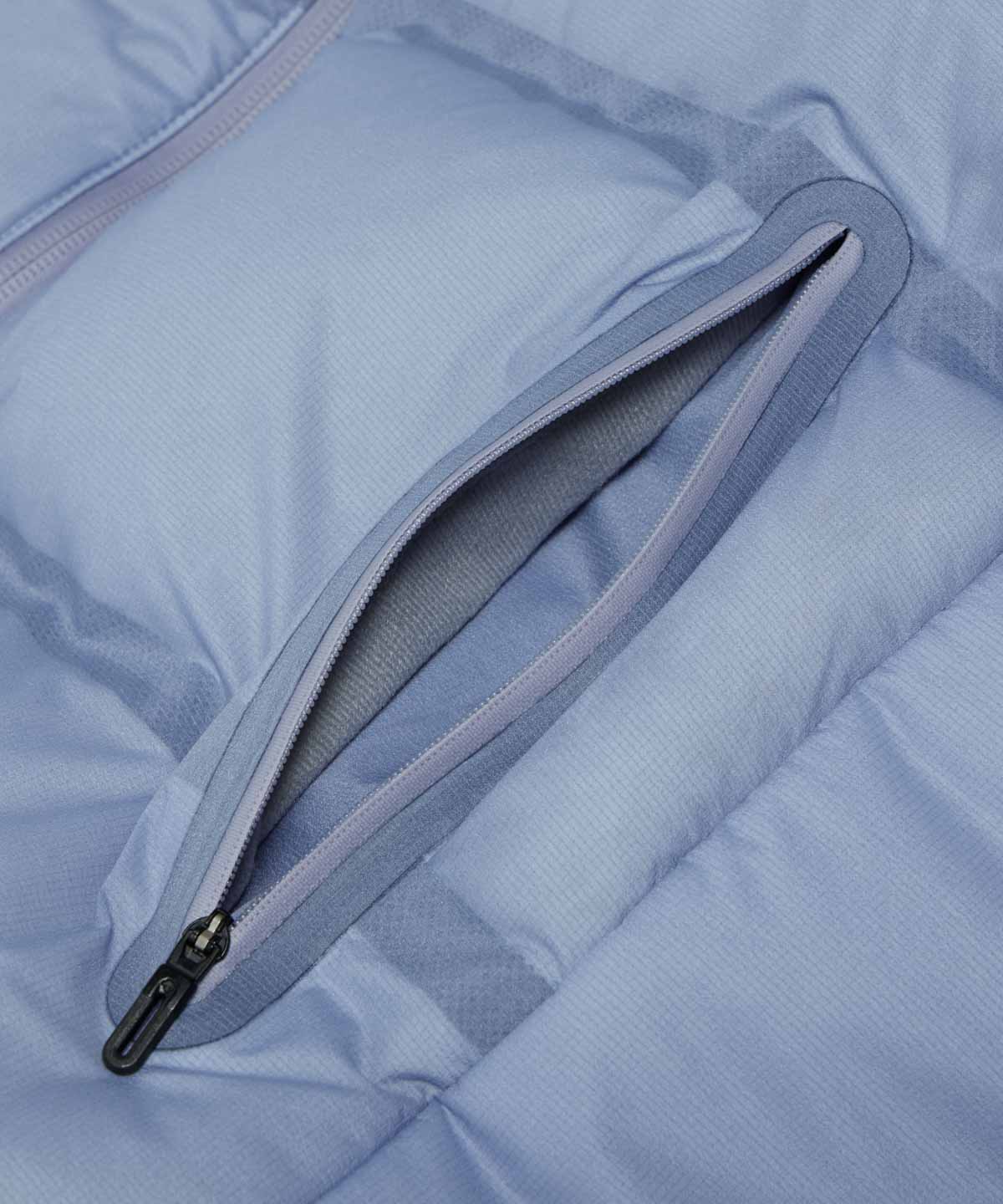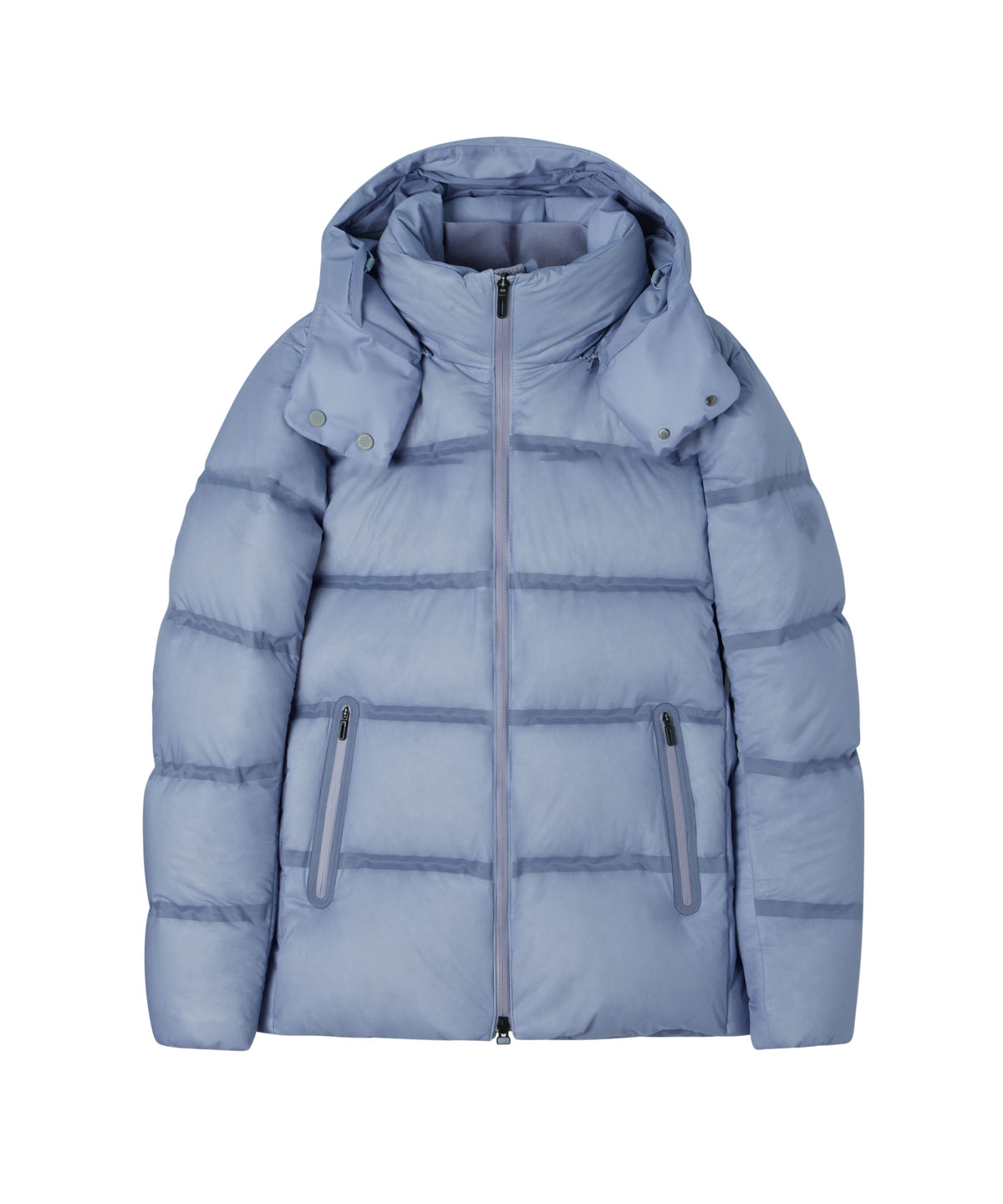 水沢ダウンの、内側の設計までこだわり抜いた美しさを表現するため、12デニールの薄くて軽い、透け感のある表地を選定。透けても黒点が比較的少なく、綺麗に見える羽毛を採用。随一の軽量性と嵩高性を発揮する1000FPのダウンを充填。