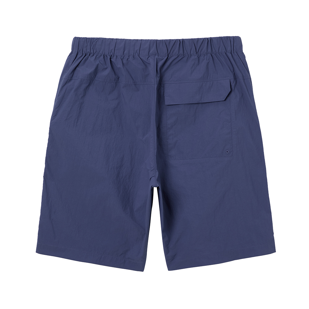 Lightweight Taslan nylon shorts. Water repellency is achieved with a CO treatment, free from decomposition-resistant fluorine compounds. The front closes with a button-and-zipper and a waist belt allows easy adjustment. Suitable for both outdoor activities and everyday wear.