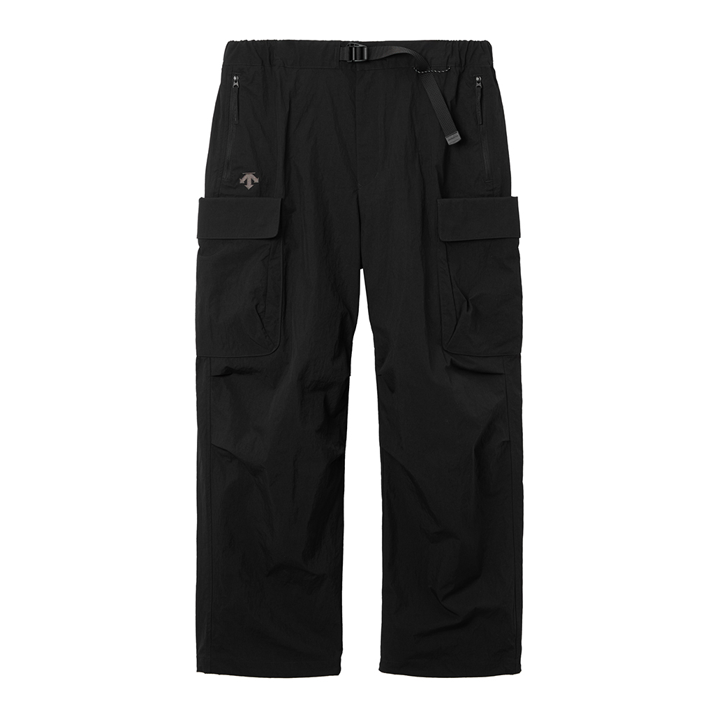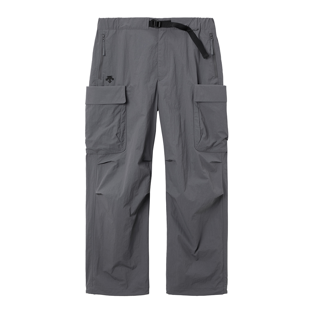 Wide cargo pants in Taslan nylon. Water repellency is achieved with a CO treatment, free from decomposition-resistant fluorine compounds. They offer excellent storage with zippered side pockets, snap-button back pockets with flaps and two large thigh pockets with dual compartments. The front closes with a button-and-zipper and a waist belt allows easy adjustment. The legs can be narrowed with rubber spindles and stoppers at the bottom hems. Suitable for a wide range of outdoor activities and everyday wear.