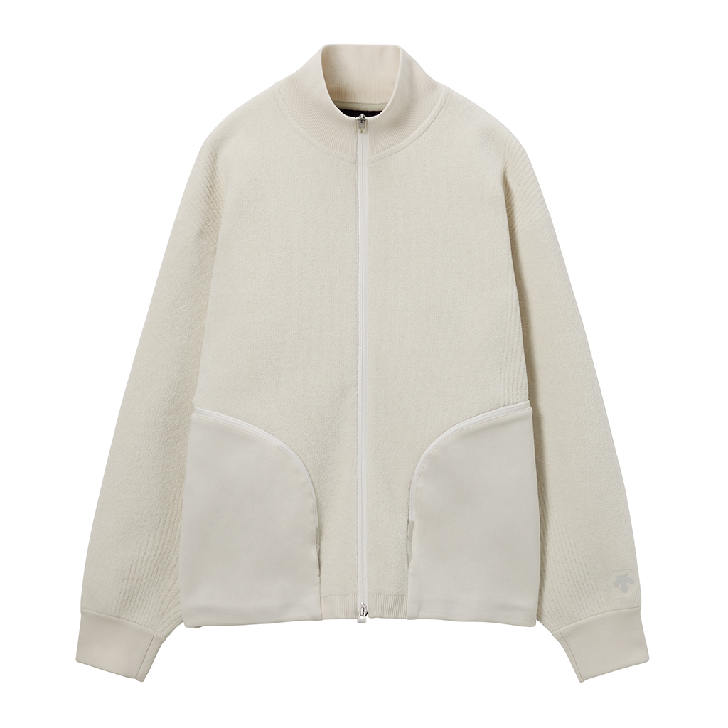 A stripe pattern MA1 bomber jacket in the FUSIONKNIT series. Different jacquard patterns are knitted into a single fabric piece for the body and sleeves for effective breathability and stretch with minimal seaming. Descente's unique pattern-making ensures a 3D silhouette and airy comfort. The textured inner knit minimizes skin contact. This MA1 bomber jacket combines freedom of movement and comfort in a seamless design using knit and sew manufacturing with ultrasonic welding and heat bonding.