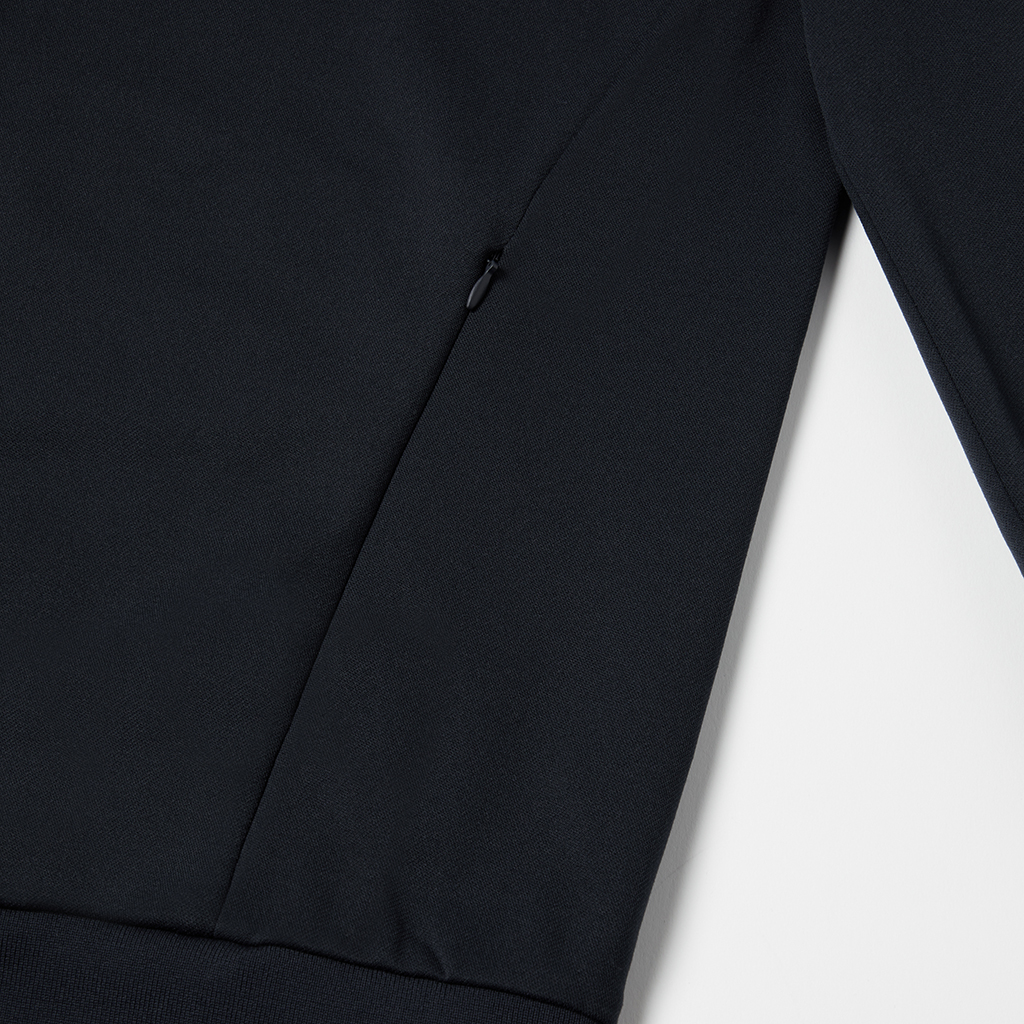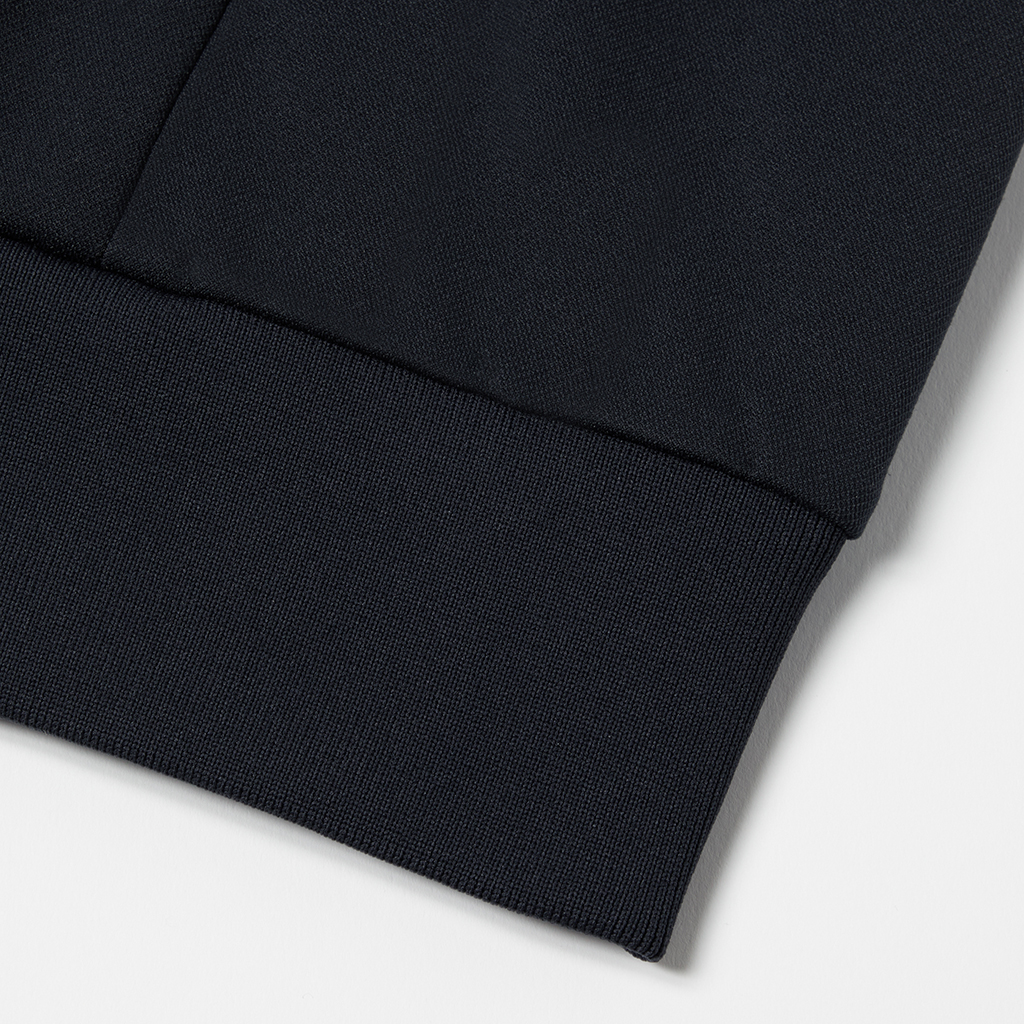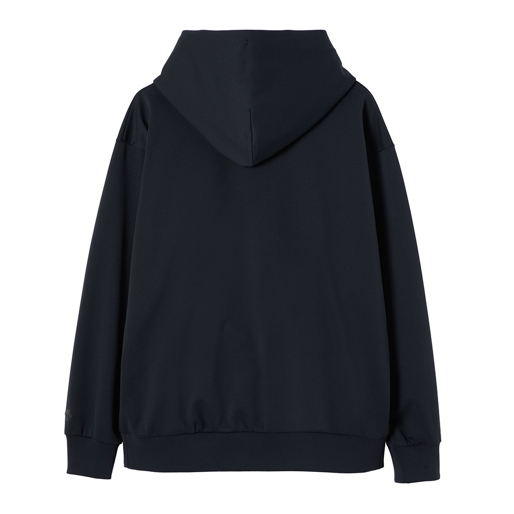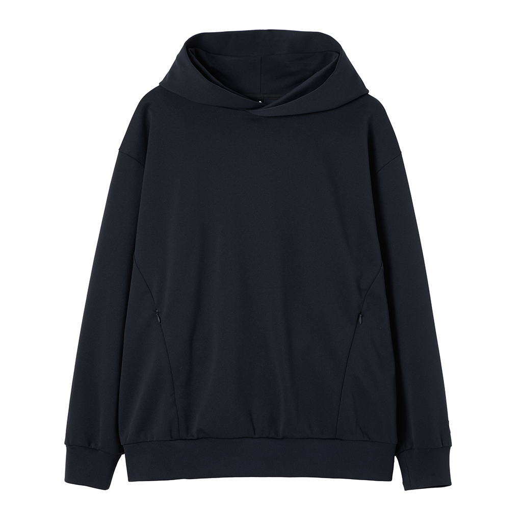 A hoodie in a moderately thick, moisture-wicking, quick-drying fabric. This season the sizing has been adjusted so it can be worn as an inner layer, designed so the sleeves do not pull up when worn under a jacket. Interfacing around the edge of the hood ensures it retains its shape when not in use. It can be worn under a jacket or with a track jacket for more casual occasions.