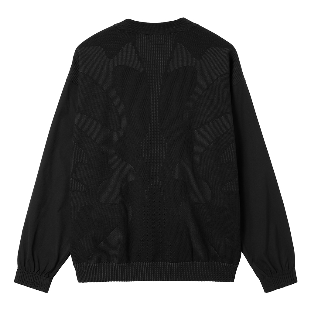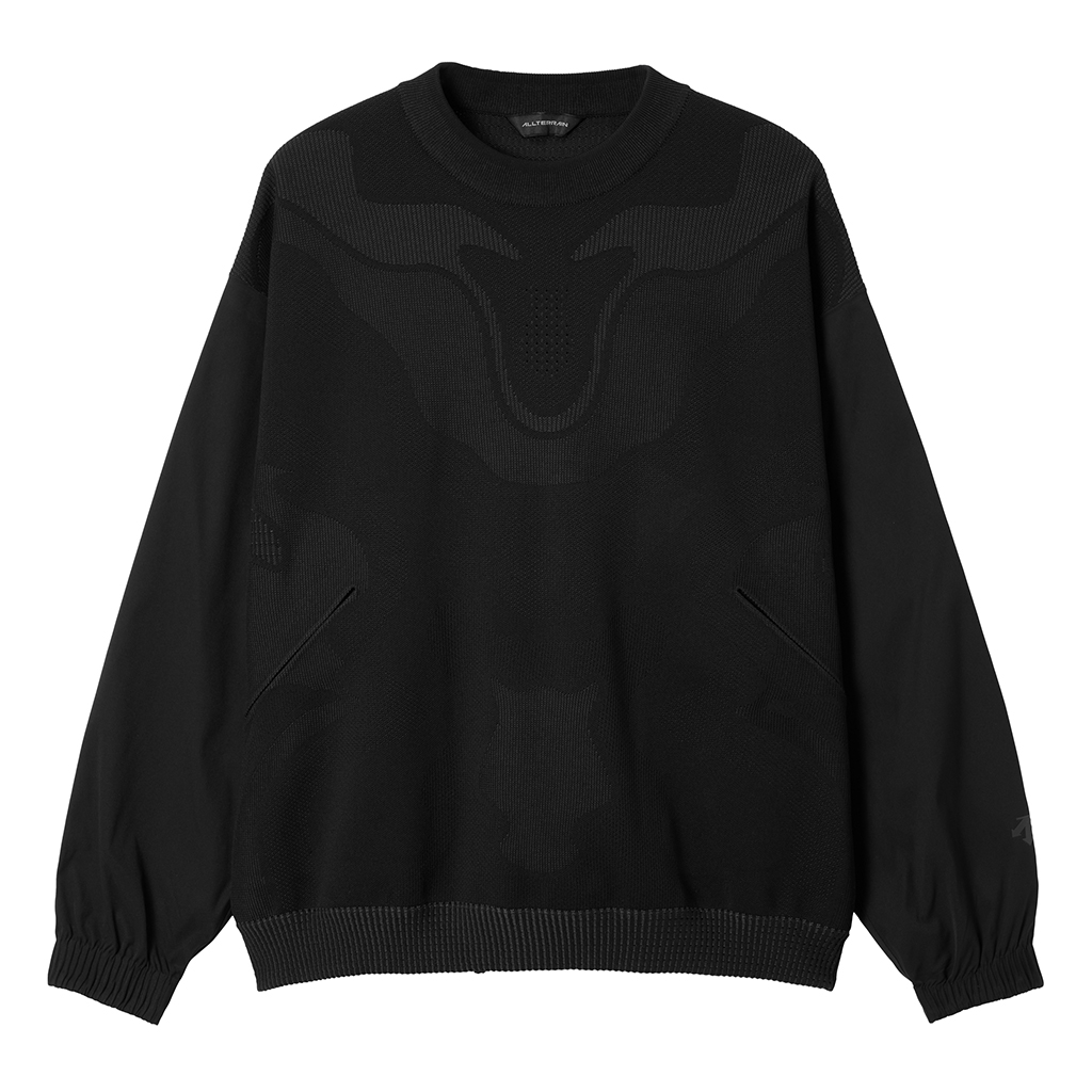 A hybrid knit crew neck in the FUSIONKNIT series with a body mapping motif on the front. Various jacquard patterns have been knitted into a single piece of fabric for temperature regulation and stretchability. The sleeves are in a glossy woven fabric, a hybrid spec adding both durability and a design accent. Descente's unique pattern-making ensures a 3D silhouette and airy comfort. This crew neck combines freedom of movement and comfort in a seamless design using knit and sew manufacturing with ultrasonic welding and heat bonding.