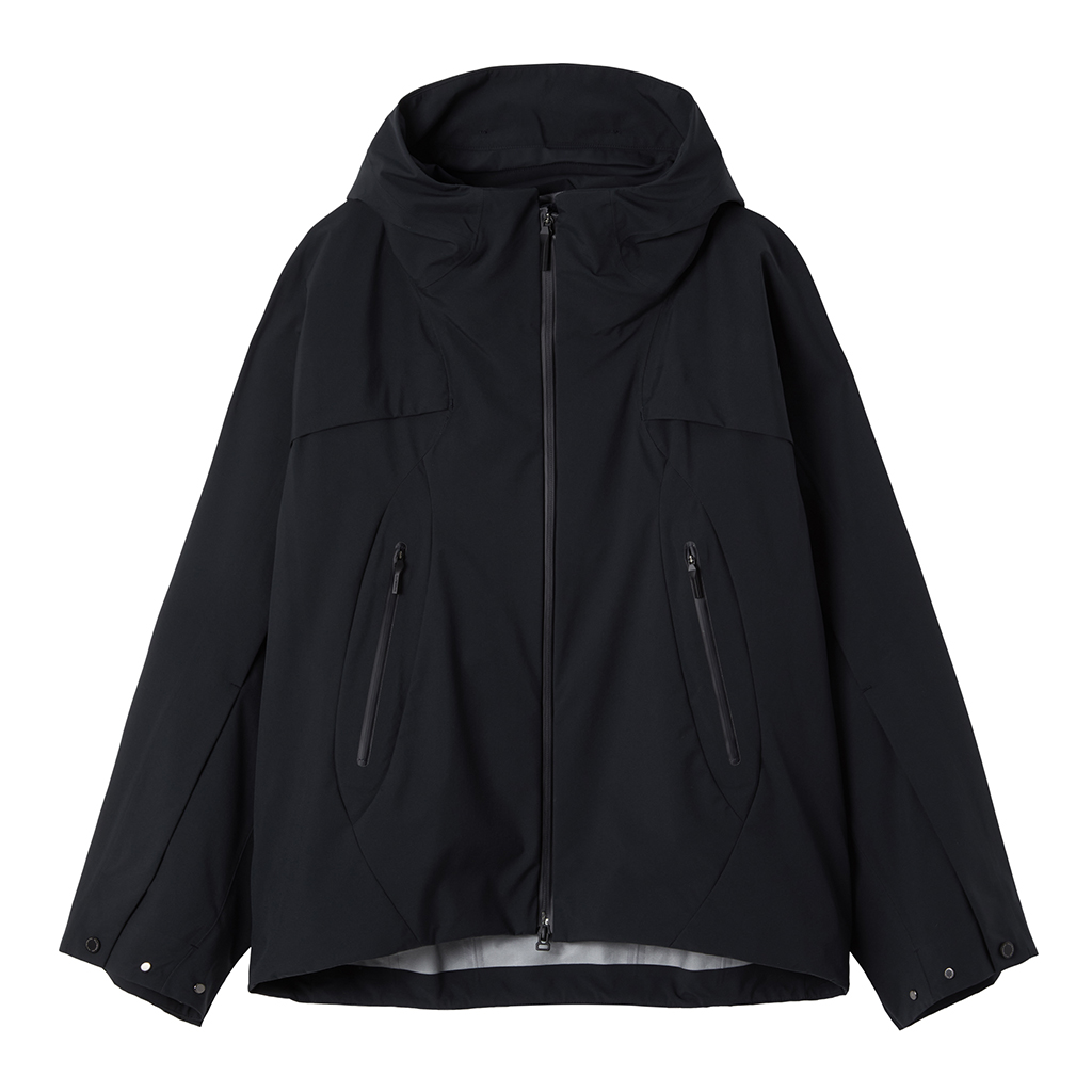 A hard shell jacket in DERMIZAX WINDTIGHT NYLON 3L offering an excellent balance between waterproofing and breathability. The silhouette is unique, designed to maximize ventilation and made with structured flaps from chest to sleeve cuffs. Air can be drawn in through the flaps and released through the back of the jacket. The front Dual-Zip Ventilation System, developed by Descente, allows fresh outside air to enter the jacket through a mesh panel between the zippers, and also expels uncomfortable heat and humidity.The short front and voluminous body and sleeves create a rounded 3D silhouette allowing air to move easily inside the garment. The hood has a Parahood System to prevent water pooling in bad weather. Snap buttons on the cuffs offer both fit and styling options.