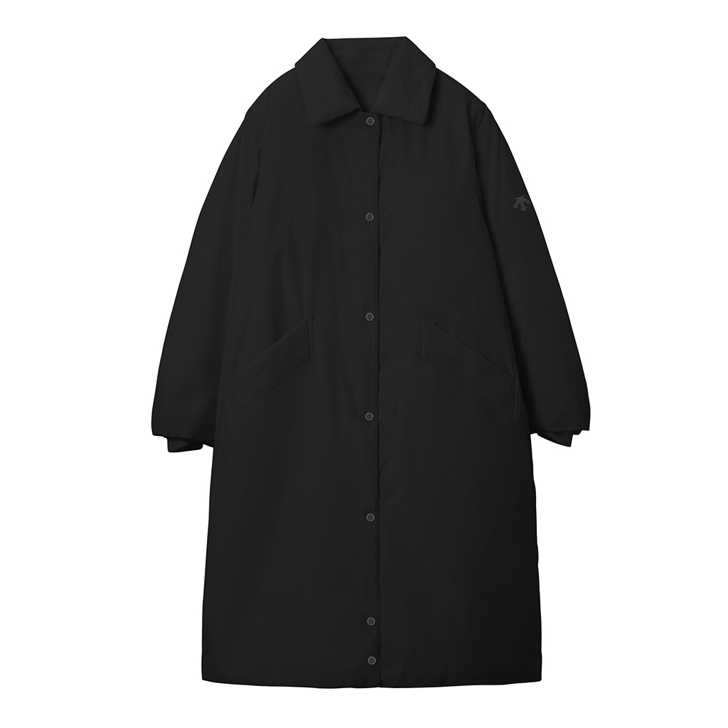 A lightweight, water repellent coat insulated with HEAT NAVI?. The generous cut through the chest and armholes allows for adding layering pieces of varying thickness underneath. Styling options are possible such as changing the silhouette with a drawstring at the hem. A simple and elegant silhouette finished with a center back tuck.