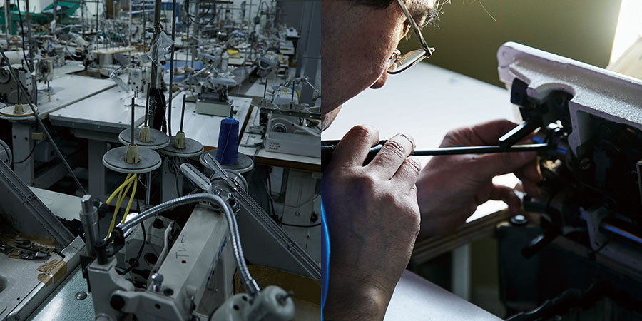 水沢工場で稼働している機械は、機械としてのマニュアルはあるが、「水沢ダウンを作る機械」としてマニュアルはない。そのため保全部門が、水沢ダウンを作る機械としてメンテナンスを行っている。たとえば、ミシンの場合。水沢ダウンの風合いを出すために、生地や縫製箇所に合わせて独自の糸のテンションの設定が必要。さらに、工場を巡回し、縫製職人のクセを見抜き、その職人に合ったオリジナルの器具を製造するなど、すべての職人が快適に作業を行えるよう、機械をカスタマイズしている。製品作りに直接携わることのない部門だが、生産効率に関わる大事なセクションだ。